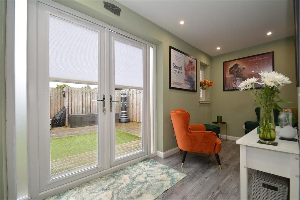 Extensively improved with a stylish interior, this impressive SEMI VILLA has been imaginatively extended and offers excellent family accommodation. Centrally situated within this sought after high amenity district, the property is nearby Pikeman Nursery, Knightswood Primary and High School, Knightswood park and golf course, Scotstoun sports and leisure centre and excellent local shopping and public transport enjoying an easy commute to the West End, City Centre and Clydebank etc. Attractively decorated throughout the accommodation comprises: Double glazed and PVC front door onto reception hall, fabulous 22' x 13 lounge/dining room, professionally designed and fully fitted 18' family sized dining kitchen with French doors onto enclosed low maintenance rear garden with deck. The kitchen preparation area comprises extensive floor and wall mounted contemporary polished veneer units with complimentary wood veneer work tops and splash back, integrated: oven, hob, hood, washing machine and wine cooler, cloakroom/toilet comprising two piece suite. First floor: main bedroom to rear with fitted wardrobes, two further bedrooms, modern fitted bathroom comprising three piece suite with shower above bath, oval wash hand basin and WC built into vanity unit, ceramic tiling full height around walls. There is in addition a floored and lined attic with velux roof light to rear. The specification includes gas central heating and PVC double glazing. The property is set amidst easily maintained gardens to both front and rear. Internal inspection of this most unique family home. • Extended Semi Villa • 22' lounge/dining • 18' dining kitchen • 3 bedrooms • Floored and lined attic • Gas central heating/double glazing