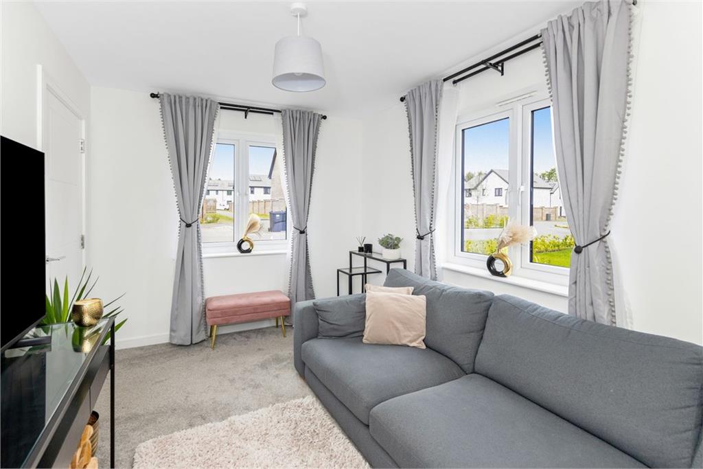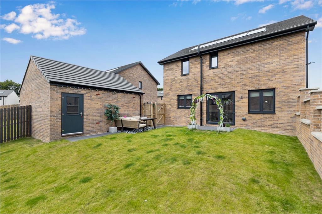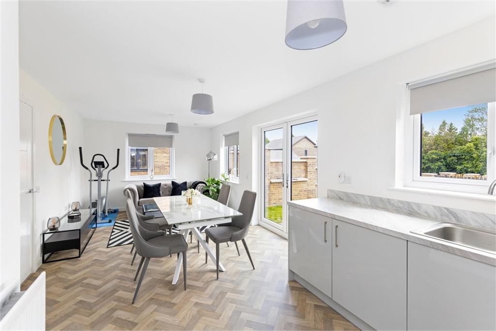 Set within a desirable modern development in the sought-after village of Kirkliston, this impressive detached villa, crafted by Dandara Homes, offers the perfect blend of contemporary style, spacious accommodation, and family-friendly living. Enjoying a peaceful position within easy reach of excellent local amenities, open green spaces, and transport links to Edinburgh and beyond, this beautifully presented home is ideal for modern family lifestyles.The property makes an immediate impression with its attractive exterior, private mono-blocked driveway, and detached garage. Internally, the home is presented in true move-in condition, offering thoughtfully designed accommodation arranged over two levels. A dual aspect living room lies to the front of the home, filled with natural light and provides a welcoming setting for everyday relaxation.To the rear, an expansive open-plan kitchen, dining and family area spans the width of the property, creating a natural hub for socialising and day-to-day living. The kitchen is finished to an excellent standards, while the flowing herringbone flooring enhances the sense of continuity across the hallway, utility room and WC. French doors open from this space to the garden, making al fresco dining and entertaining effortless. A separate utility room and ground floor cloakroom/WC add convenience and practicality.Upstairs, the home continues to impress with four spacious bedrooms, all finished in a fresh, neutral style. The principal bedroom features an en-suite shower room, while a sleek family bathroom serves the remaining rooms with a stylish three-piece suite and overhead shower.The south facing rear garden is fully enclosed and thoughtfully landscaped, offering a safe and private retreat for children to play and adults to entertain. A well-maintained lawn is complemented by a paved patio area, ideal for outdoor dining or summer gatherings. A side door allows access from the garden directly into the garage.Further benefits include gas central heating, double glazing, solar panels for improved energy efficiency, and excellent storage options. With its contemporary finish, well-balanced layout, and enviable location, this outstanding property offers a superb opportunity for buyers seeking a quality family home in a thriving village setting. Factoring: SGPM: Approx. £25 P/M