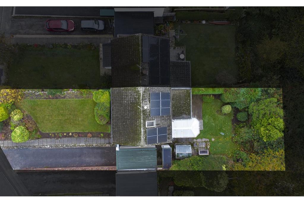 - Beautifully maintained front and rear gardens with lawn, patio area, mature shrubs, and outbuilding for storage/workshop