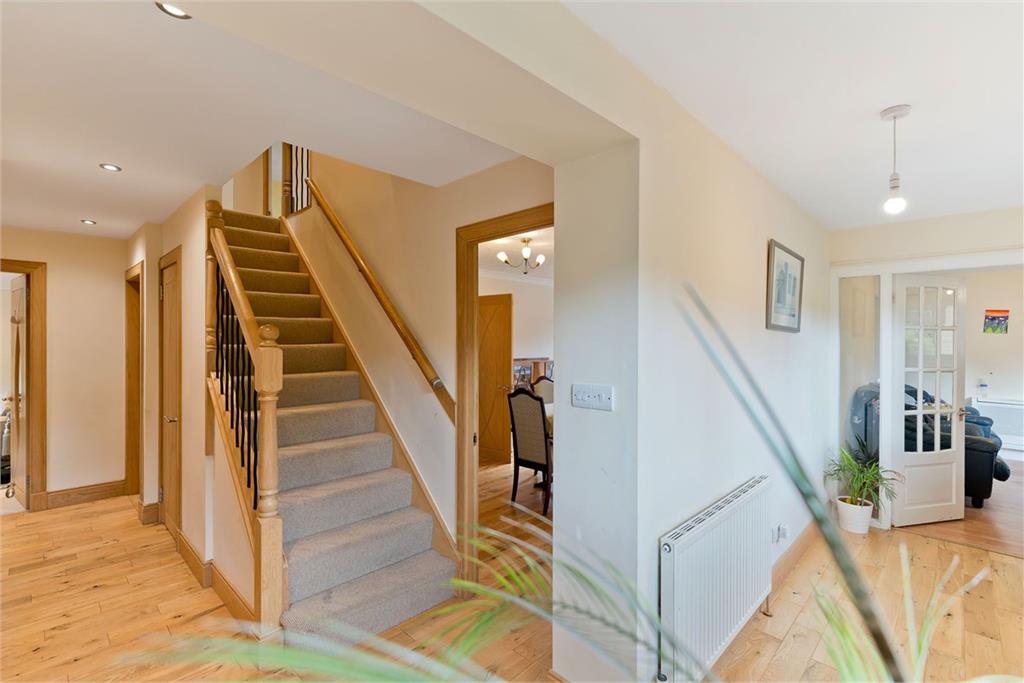 Generous detached house in Brunstane, offering four reception/living areas, a dining kitchen, five bedrooms, and four bathrooms (plus a separate WC), as well as a low-maintenance garden, a double garage, and two private driveways. This five-bedroom, four-bathroom detached house in Brunstane represents the perfect family home, with a wealth of flexible living space for multigenerational living, gardens, and excellent private parking. Furthermore, it is ideally placed for easy access to the amenities that the area has to offer. These include shops (Fort Kinnaird and an Asda Superstore are within walking distance), transport links connecting across the city and further afield, with Brunstane train station just two minutes away by foot, Portobello beach only a 10-minute walk, primary and secondary schooling, and a wealth of green space, with Brunstane Burn Path adjacent to the property. An entrance vestibule welcomes you into the home and leads through to an airy, inviting hallway with built-in under-stair storage and a two-piece WC. The home has four spacious and flexible reception/living areas, giving the new owner excellent scope to use them in different ways to suit their own needs. The living room occupies a spacious footprint that allows for various configurations of lounge furniture and it is illuminated by a large window with a window seat. A fireplace creates a warming focal point, whilst the living room also features a fitted bookcase. The formal dining room is conveniently connected to the kitchen and creates the perfect setting for family meals and dinner parties, with ample space for at least a six-seater dining table alongside additional furniture. There is also a large, triple-aspect family room that could be utilised as a more informal living room, a TV room, a children's playroom, or a teenager's den, and benefits from garden access. Finally, there is a gym/games room/bedroom 5 to the rear of the property, adjoined by an en-suite shower room, lit by dual-aspect windows, and featuring a useful integrated air conditioning unit and a ceiling mounted projector. The kitchen comes well-appointed with attractive, modern wood-styled wall and base cabinets, spacious worktops, and stylish splashback tiling, with a Rangemaster cooker neatly housed within the cabinets and paired with an extractor hood. Integrated appliances comprise a fridge/freezer and dishwasher, whilst provision is made for a casual dining area, and the kitchen is supplemented by additional built-in storage, garden access, and a utility room with cabinets, workspace, and space for laundry appliances. The house accommodates five well-proportioned bedrooms, with one on the ground floor and the remaining four on the first floor. The ground-floor bedroom is currently being utilised as a games room and comes with its own en-suite shower room. The ground floor also houses a home office, ideally placed at the front of the property. The first-floor bedrooms are approached via a staircase and an airy landing with built-in storage, and they are all good-sized doubles with excellent built-in storage. The two largest bedrooms additionally benefit from their own en-suite shower rooms. The principal bedroom's stylish en-suite comprises a large enclosure with a rainfall showerhead and handset, twin sinks atop a vanity unit, and a WC, whilst bedroom two's comes complete with a shower enclosure, a vanity unit with an inset basin, and a WC. Finally, the family bathroom comprises a bath with an overhead shower and a glazed screen, a large basin with a vanity unit underneath, a WC, and a tall chrome towel radiator. The home is kept warm by gas central heating (powered by a brand-new boiler) and the windows are all double glazed. Externally, the family home is accompanied by a low-maintenance, paved side garden area and a rear garden with easy-upkeep paving, a lawn, and a wealth of leafy shrubbery. Excellent off-street parking is provided by a double garage and two private driveways. Extras: All fitted floor coverings, most window coverings, light fittings, cooker, and integrated kitchen appliances will be included in the sale.