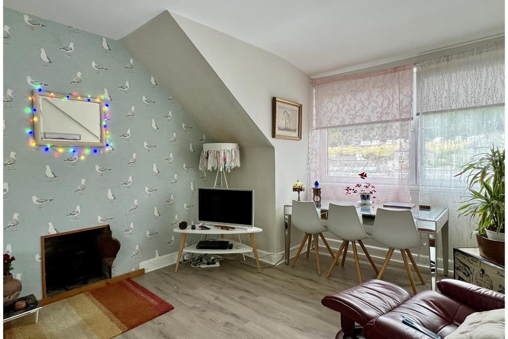 Bright and spacious front facing reception room. Wood effect laminate flooring. Two generous windows enjoying a pleasant outlook to Barrhill Woods and further dormer window with outlook to the west across the Soaperie Gardens to Kirkcudbright estuary beyond. Partially coombed ceiling. Two radiators.