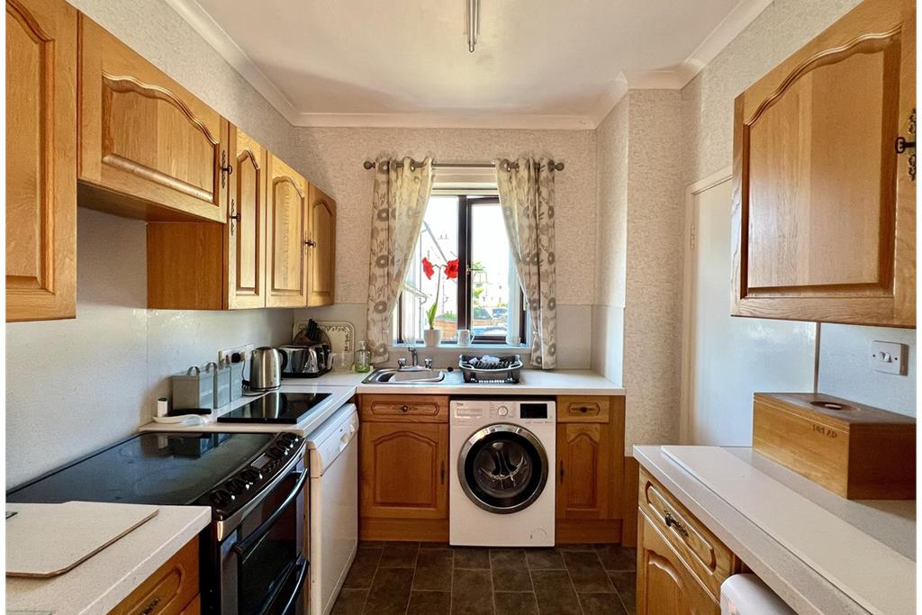 Good range of wooden fitted kitchen units with laminate work surfaces. Stainless steel sink with drainer to side and mixer tap above. Freestanding electric cooker. Zanussi dishwasher. Under counter fridge. Space for under counter freezer. Washing machine. uPVC double glazed window to front with venetian blinds, curtain pole and curtains. Fluorescent strip light. Tile effect vinyl floor. 15 pane glazed door leading into:-