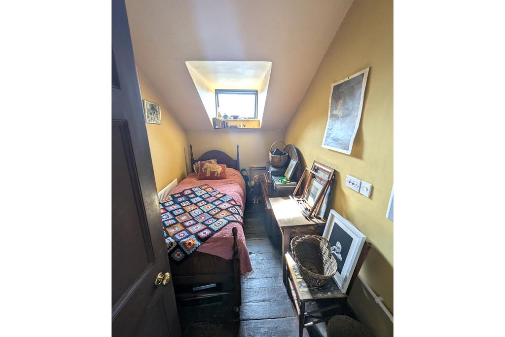 Door into bedroom four from the second floor hallway, bay window looking out to the rear, radiator, fireplace with multifuel fire, storage cupboard.