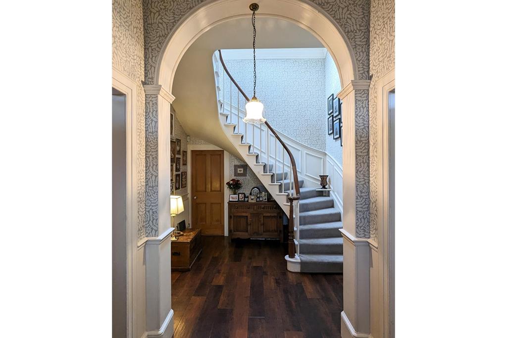 Entrance hallway with wooden flooring and a sweeping staircase leading to upper accommodation. Off the hallway are doors to two spacious reception rooms, the main bedroom, family bathroom and a passageway to further living areas.