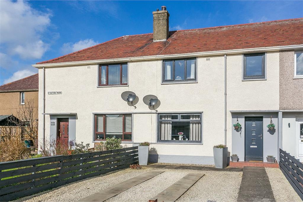 Immaculately presented, three-bedroom, south-facing, mid-terrace home, with a driveway and garden. Located in a quiet and popular residential area of Port Seton, East Lothian. Comprises an entrance hallway, living room, kitchen, three double bedrooms, and a family bathroom. Highlights include a modern fitted kitchen and bathroom, and an upgraded anthracite front door and double-glazed window frames. Tastefully finished throughout in contemporary decor, further features include gas central heating and good storage provision including a loft. Externally, the property benefits from low-maintenance landscaping incorporating the driveway, whilst an enclosed rear garden features a patio, lawn and two store sheds. A welcoming entrance hall affords access to the carpeted stairs leading to the upper hall and throughout the ground floor, and features ample understairs storage space. Set to the front, a spacious living room enjoys a southerly-facing aspect with plentiful natural light, and features carpeted flooring, a central light fitting, plain coving and a fireplace with a stove. The kitchen is set to the rear with a door leading to the garden, wood effect flooring and a convenient built-in cupboard, whilst fitted modern units and worktops include a sink with a drainer, a tiled surround and space for freestanding appliances. Completing the ground floor, the bathroom is fitted with a contemporary three-piece suite including a mains mixer shower over the bath and tiled splash walls. On the upper floor, bedroom one is set to the front, offering a generous room size with carpeted flooring and superb storage with a built-in mirrored wardrobe and a further built-in cupboard. Two further carpeted bedrooms are set to the rear, similarly well-sized, both with built-in storage.