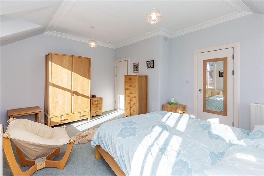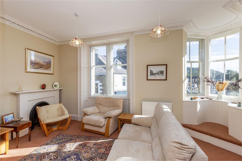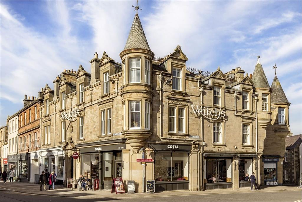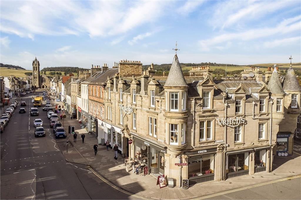 Welcome to 4A High Street Located in the Peebles conservation area, this beautiful double-upper corner flat resides on the first and second floors of a striking B-listed Victorian building (1886) with corner turrets and a sandstone façade. Move-in ready, the property boasts period architecture and modern neutral interiors. It features a large open-plan reception area, a stylish kitchen, a bathroom and an en-suite. It also has two double bedrooms and offers delightful views over Peebles. Take A Look Around Upon entering, you are warmly greeted by a vestibule and a hall with built-in storage. On the right is the open-plan breakfasting kitchen, living and dining room, which has an expansive footprint lined with sash windows for a cascade of daily sun. Elegant neutral décor elevates the space further, along with the period cornice work and the curvature of the turret. The kitchen adds to the overall aesthetic too, enjoying a chic design with chunky wooden worktops and generous cabinet units in two different styles. It is a highly effective look that ensures excellent practicality as well. It incorporates a return that doubles as a breakfast bar and includes a selection of appliances. Head On Up Upstairs, a naturally-lit landing leads to the two double bedrooms, both of which are decorated in light neutral hues and with soft carpeting. The large principal suite has a wonderful array of multi-aspect windows, including a curved bay that forms the building’s eye-catching turret. From its vantage point, this room also enjoys inspiring views over Peebles’ High Street. For added luxury, it has a modern en-suite shower room as well. The second bedroom, framed by a feature fireplace and a vertical radiator, is also a spacious double that adds versatility to the home, allowing it to be used according to your needs. A three-piece family bathroom (with a handheld shower) finishes the accommodation. Gas central heating and secondary-glazed sash windows ensure year-round comfort. Tour The Grounds Outside the flat, you are just a stone’s throw from the wide variety of shops and eateries on Peebles’ thriving High Street. Bus links are also a mere stroll away and there is on-street parking in the vicinity as well. It is a highly convenient location. The Details All fitted floor and window coverings, light fittings and shades, integrated appliances (double oven/microwave, ceramic hob, concealed extractor, and dishwasher), a freestanding fridge/freezer, tumble dryer, and a washing machine to be included in the sale. The sale of this property is not subject to an onward chain Tell Us About: Peebles Nestled in the Tweed Valley within the Scottish Borders, the charming Royal Burgh of Peebles is a historic and picturesque town. The town has been recognised as the ‘Top Independent Retailing Town in Scotland’ with a wealth of independent shops as well as a handful of high-street supermarkets, including a Tesco superstore, banks, and a post office. The town is home to numerous top-quality restaurants, bars and cafés and is considered a cultural hub, with the distinguished Eastgate Theatre & Arts Centre hosting a wide range of events throughout the year. There are also several annual festivals held in the town, including the Beltane Festival, the Peebles Jazz Festival and the renowned Arts Festival. Situated on the banks of the River Tweed, famous for salmon fishing, and set within an area of outstanding beauty, Peebles promises a perfect base from which to enjoy all the countryside has to offer – from scenic riverside and parkland walks to horse riding and cycling. There is also an 18-hole golf course within the town, as well as a leisure centre and a swimming pool. For those with children, Peebles’ catchment area encompasses some highly-regarded schooling, from nursery to secondary level. Peebles is also a popular Scottish Borders retreat for commuters, located just over 20 miles from Edinburgh city centre and within easy commuting distance from the city bypass, airport and motorway network.