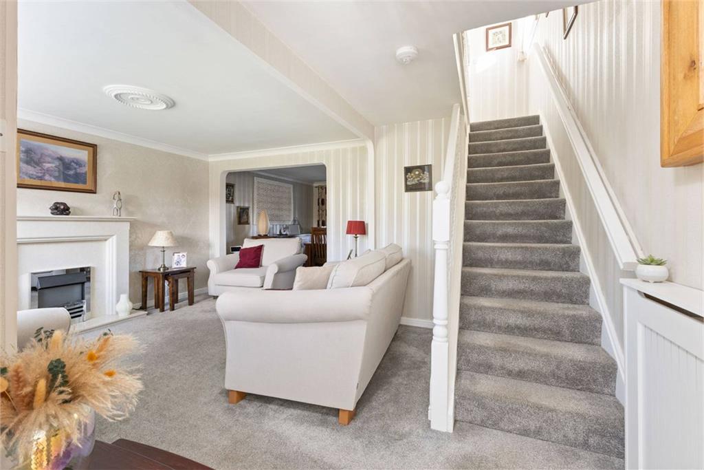 Step through the front door into a bright and welcoming entry vestibule. The home’s layout and generous windows mean it is naturally filled with light throughout the day. To the left sits the spacious living room, seamlessly flowing into the dining room via large flat archways, creating an open, airy feel and enhancing the sense of space and connectivity. Adjacent to the living room is the modern, well-appointed kitchen, complete with five-ring gas hob, oven, grill, integrated fridge/freezer, washing machine, dishwasher and excellent countertop and storage space. Both the kitchen and dining room provide access to the thoughtful rear extension creating a further sitting room flooded with natural light thanks to two skylights and French doors leading directly to the rear garden. A perfect spot for family relaxation or entertaining. Upstairs, the property offers two generous double bedrooms and a further single bedroom, ideal for a child’s room or home office. Completing the accommodation is a stylish three-piece family bathroom. Externally, the home features a substantial rear garden, ideal for children, pets or outdoor dining, along with a standalone single garage and off-street parking located to the rear of the property. To the front, a beautifully kept garden opens onto peaceful footpaths meaning no road or traffic directly in front, this setting provides a safe and serene environment. A superb family home in a popular and quiet residential setting — early viewing is highly recommended. Electricity Supply: Scottish Gas Water Supply: Scottish Water Sewerage: Scottish Water Broadband / Mobile Coverage: Vodafone, Full 5G Coverage