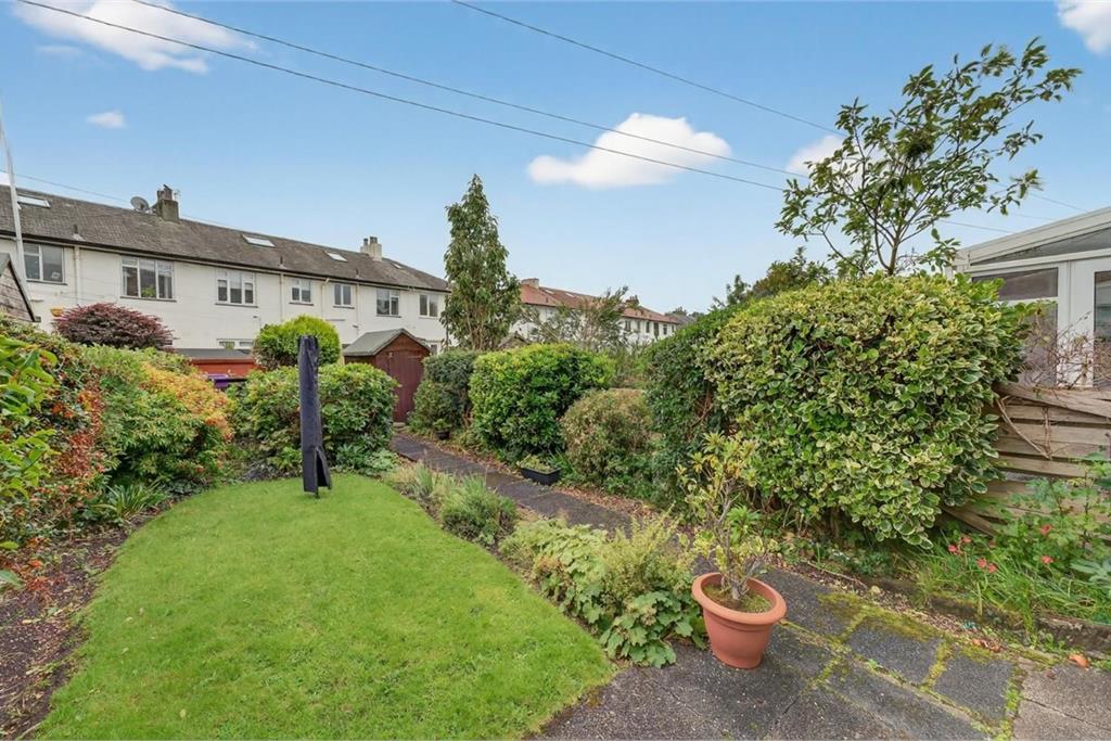 Front garden with mature shrubs, south facing back garden with small patio area, drying area, garden shed, mature shrubs and access to lane.