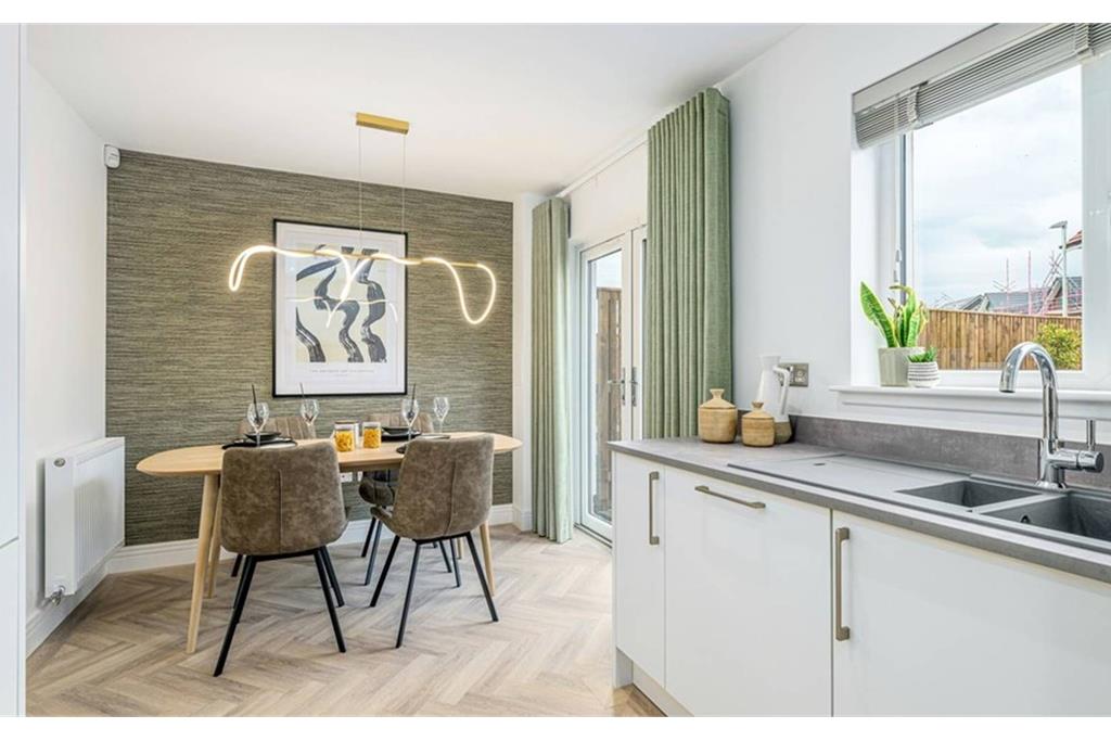 This sophisticated home provides the ideal in flexible family living space. The modern studio-designed kitchen and family/dining area is open plan, enjoying access to the patio and rear garden via French doors, allowing you to extend you living on a sunny day or when friends are round. Downstairs you also enjoy a separate (yet interconnecting) lounge, downstairs WC, excellent storage and welcoming vestibule, while on the first floor you'll be greeted by a spacious upper landing, off which find two double bedrooms and a single (perfect as a home office, nursery or hobby room), all enjoying fitted wardrobes. The Allan's light and airy ambience is complemented with a high specification family bathroom, including Porcenalosa tiling, illuminated mirror with demister pad, and Laufen sanitaryware and vanity unit. What's more, all our Allan homes enjoy Siemens integrated applicance including oven, microwave and dishwasher included, as well as PV panels and access to EV charging. • PEA Rating: B *Images are for illustrative purposes and layouts may vary depending on the individual plot*