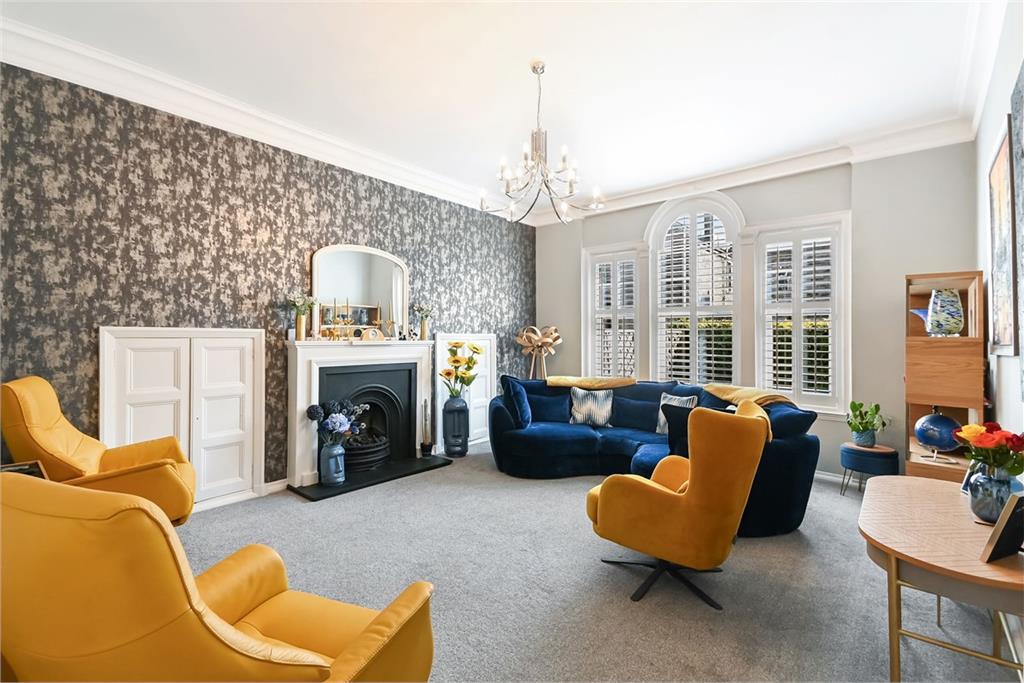 This is a stunning lounge of excellent proportions and features a large arched window allowing ample natural light. Beautiful working gas fire. Front.