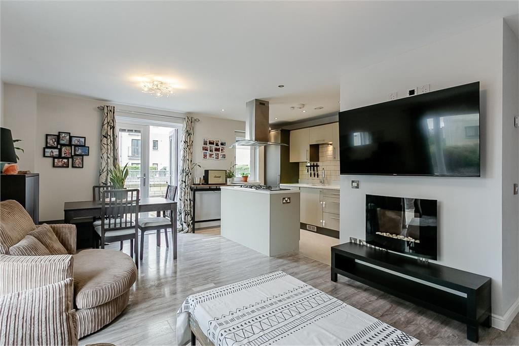 Located within an exclusive waterfront development at Granton Harbour, this impressive two-bedroom ground-floor apartment offers spacious, contemporary living with a private patio terrace and an allocated parking space. Set in a modern, factored residential complex just north of Edinburgh city centre, the property combines stylish interiors with a superb coastal setting. Comprises an entrance hallway, open-plan living/dining room and kitchen, two double bedrooms, an en-suite shower room, bathroom and utility room. Highlights include a modern, fitted kitchen with integrated appliances and white granite worktops, as well as fitted bathroom suites and underfloor heating throughout. In addition, there is excellent storage provision, generous room sizes, tasteful decor, contemporary lighting, and fibre-optic media connections. The development also boasts a shared courtyard, a secure video entry system, a burglar alarm, a lift service and an allocated space in a secure underground parking facility. A welcoming entrance hall with two generous storage cupboards leads into a bright and spacious open-plan living area. Benefiting from a dual-aspect layout, this sociable space enjoys an abundance of natural light, featuring wood-effect flooring, a wall-mounted TV point and electric fire, and dual access points to the private decked terrace, which includes a swing—ideal for relaxing or entertaining. To one side, a stylish kitchen is fitted with modern units and worktops, a tiled surround, and an island unit with a four-ring gas hob. Integrated appliances include an eye-level oven and dishwasher, while a separate utility room provides additional storage and houses the washing machine and fridge/freezer. Both double bedrooms are well-proportioned and tastefully finished with neutral decor, carpeted flooring, and built-in wardrobes. The master bedroom further benefits from a modern en-suite shower room and direct access to the patio via French doors. Completing the accommodation is a stylish family bathroom with a three-piece suite, overhead shower, and tiled splash walls. An EWS1 form has been obtained and can be found at the back of the Home Report. Factor Fees: James Gibb - £126/month A 360 virtual tour is available online.