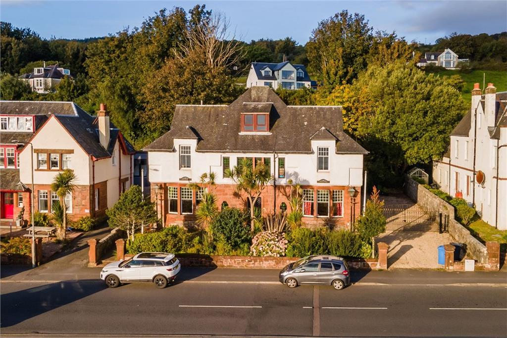 Chain Free & Ready for Immediate Occupation! Offering a wealth of accommodation and limitless potential, Invermay is an exceptionally large and highly sought-after detached villa that covers an impressive 4,321 square feet across three floors. The C-listed Edwardian building, built in 1905, is of significant architectural importance too, designed in the early Art-Deco style, with stunning architecture and original features. Currently used as a private home, it was previously run as a successful guest house by the current owners for seven years. Many years ago it was also a hotel, so the property is highly versatile, offering buyers a wide variety of uses and the chance to develop a lucrative income from it. Subject to any appropriate permissions, it could easily be reverted into a hotel or guest house and the top floor (once used as the owner's accommodation) could also become an independent flat or further accommodation. Adding to the appeal of this outstanding Edwardian property is its location, set directly on the coast of Whiting Bay with spectacular beach and sea views. Stepping into Invermay, you are greeted by a grand reception hall with well-retained period features and walk-in storage. The accommodation from here is all well connected, including the five reception rooms, which are comprised of: a living room with a log-burning stove; a dual-aspect lounge with traditional styling, a bay window, and a period feature fireplace; a dual-aspect formal dining room with a bay window and a beautiful feature fireplace; a sunroom with rear garden access; and, a private snug for relaxation. In addition, a dining kitchen comes well-appointed with cabinet storage and wood-toned worksurfaces. It has floorspace for a table and chairs, and an open-plan with a large scullery (equipped with storage). Also on this floor, there are two WCs, a laundry room/store, and an office/bar fitted with a counter and cubby storage. On the first floor, a landing (with storage) extends to five double bedrooms (One has an interconnecting single bedroom) that are all equipped with en-suite shower rooms. There is a useful study enjoying views over the beach. A bright three-piece bathroom, with a shower over bath, completes this level. The second/top floor features an open-plan sitting room that connects to five additional rooms, a three-piece bathroom, and a three-piece shower room, providing further flexibility and potential to the property and offers a variety of living options. It has oil-fired central heating and a mix of single and double-glazed windows. Externally, there is a low-maintenance front garden, framed by beautiful palms, which has a patio overlooking the beach – perfect for watching the tranquil sea and local wildlife. In addition, a large rear garden also has a patio area for summer dining and a generous lawn backed by mature trees. A gated driveway provides secure off-street parking for multiple cars. Area Whiting Bay Whiting Bay is located on the south east corner of the island and overlooks the Firth of Clyde, with views to the very southern point of Scotland. The village provides a newsagent, post office, pharmacy, two general food stores, café/bar, restaurant, bistro, hardware store and a farm shop. There is a craft outlet and art gallery, as well as a picturesque 18-hole golf course. Primary schooling is available in the village and secondary schooling is found at the High School in Lamlash. The surrounding area provides some of Arran's most scenic walks, not only along the shoreline, but also through the forest to Glenashdale Falls. The Isle of Arran, approximately 167 square miles in area, is sometimes referred to as 'Scotland in miniature', as it is divided into highland and lowland areas by the Highland Boundary Fault. The island is a popular destination for geologists, due to the substantial volcanic activity around 16 million years ago in the Tertiary period. There are many stone circles and standing stones dating from Neolithic times, including those on Machrie Moor and the Giants Graves above Whiting Bay. Arran is approximately 60 miles in circumference and has some of the finest scenery in Scotland, with excellent walking, rambling and sea and trout fishing. Tourist attractions include Arran Aromatics, Arran Heritage Museum, Lochranza Distillery and Brodick Castle. There are seven golf courses on the island with Invermay ideally positioned for easy access to Whiting Bay Golf Club.
