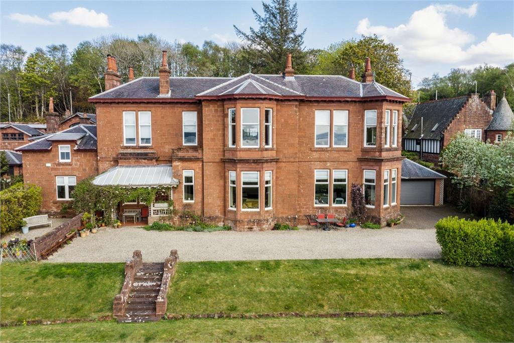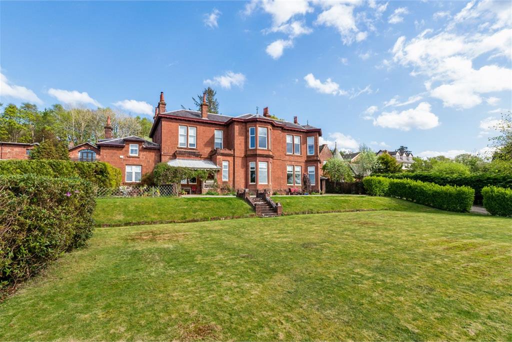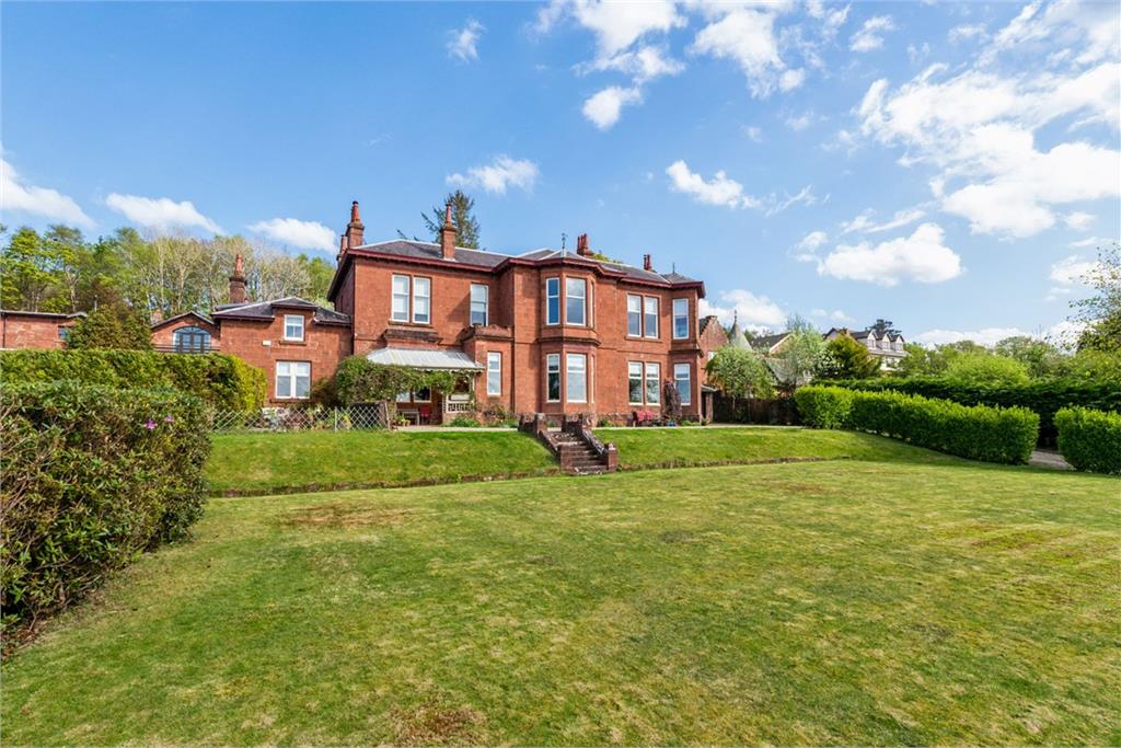 Prominently positioned in one of the most sought after locations in the popular coastal village of Skelmorlie and presented in superb internal and external order, Mallowdale, 9 Montgomerie Terrace is a stunning lower conversion of a traditional red sandstone mansion house that makes a fabulous home for a broad range of clients. The property has architectural links to John Honeyman and retains many of its original features including cornice work and stained glass which are preserved in excellent condition. Mallowdale sits in expansive garden grounds and has panoramic views of the Firth of Clyde from the dining kitchen, living room, master bedroom and private west facing lawned gardens. The property is well placed for ease of access to the centre of the village with its local amenities and for the commuter the mainline train terminal at Wemyss Bay has a direct regular service to Glasgow. In more detail the accommodation on offer comprises a sheltered external porch which gives access to a broad reception hallway with original wood panelling. The hall opens to a spacious drawing room with ornate cornice work, bay window with excellent views and Jetmaster multi fuel open fire. The hall also leads to a bright dining sized kitchen fitted with a range of wall and base units with polished granite benchtops, a large central island, woodburning stove and an extensive range of integrated appliances. The kitchen and dining area also feature garden and water views. The layout of the property currently has four double bedrooms with two having ensuite facilities. The master bedroom has fine views over the Firth of Clyde. An additional home office, study or living room completes the main accommodation of the property. The family bathroom extends to more than two hundred and sixty square feet and is fitted with a period style five piece suite to include WC, wash hand basin, stand-alone claw foot bath, bidet and separate shower cubicle. In addition to the above the property has double glazing, gas central heating and private driveway parking leading to an attached double garage with remote controlled door, power and light. There is a beautiful area of private lawn to the front of the property with a westerly aspect taking full advantage of the excellent views.