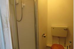 ( 1.8 m X 1.6 m / 5'11" X 5'3" )White suite comprises enclosed shower unit, W.C. and wash hand basin. Wood effect floor covering, overhead light and radiator. -
