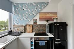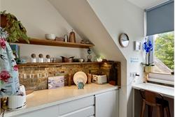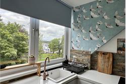 ( 2.96 m X 2.62 m / 9'9" X 8'7" )Light and airy kitchen with a good range of fully fitted kitchen units. Stone effect laminate work surfaces. Built in Lamona single oven with grill. Integrated Bosch ceran burner electric hob above. Built in Candy drinks chiller. Space for fridge freezer. Breakfast bar area providing useful additional seating. Belfast style ceramic sink with mixer tap above. Integrated lights above work surface and beneath floor units. Window with roller blind above. Radiator. Ceiling light. -