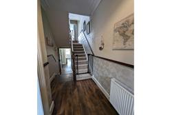 Wooden door into vestibule, wooden door with glass panels into hallway. Karndean tiled flooring, radiator, steps down to utility door and cellar door. Doors to living room and dining room, stairs to upper accommodation. -
