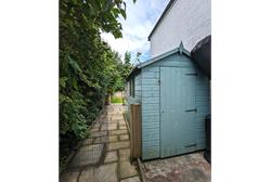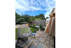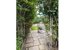 Patio consisting of concrete slabs, a lawn area surrounded by shrubs, access from the rear to the front via a side path. -