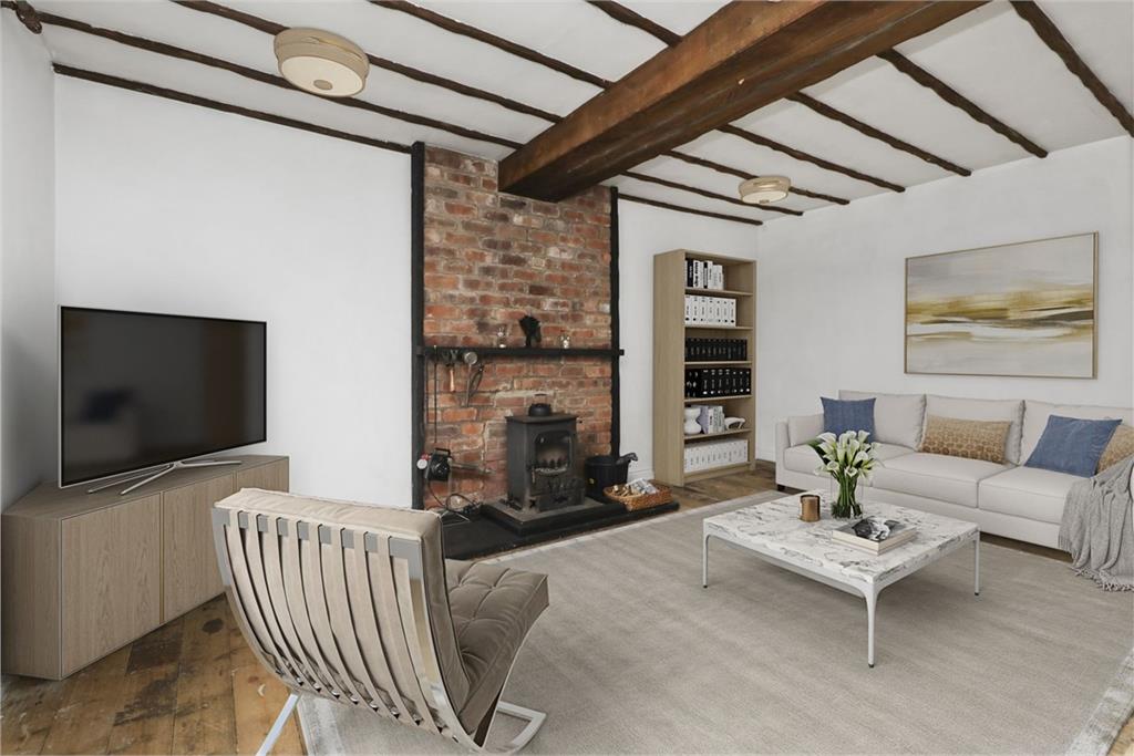 - Living room with exposed brick and beams
