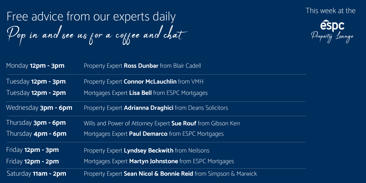 Looking for answers about buying or selling a home? Curious about legal processes like conveyancing, Wills, or Power of Attorney? Have a question about mortgages? Our daily Ask the Expert sessions at the ESPC Property Lounge are here to help!